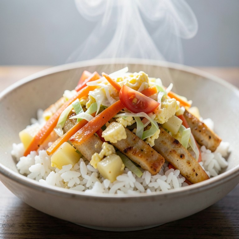 Un salteado nutritivo y completo que combina vegetales frescos, huevo revuelto y tiras de pollo, ideal para una comida equilibrada y reconfortante.