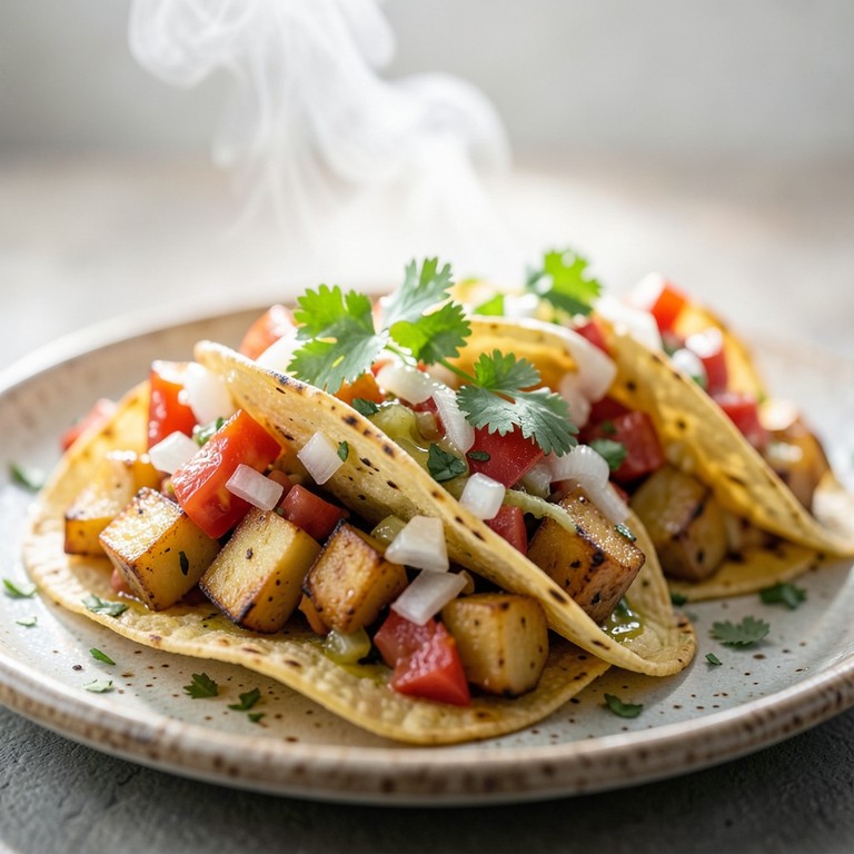 Una opción saludable y deliciosa que combina el dulzor natural del plátano macho con la textura de las papas y la frescura de un sofrito de tomate y cebolla, todo servido en tortillas de maíz.