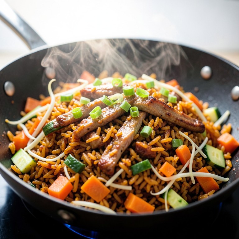 Un arroz frito vibrante y aromático que combina la técnica clásica del salteado chino con la intensidad especiada de la pasta de curry rojo tailandés, creando un plato equilibrado y lleno de color.