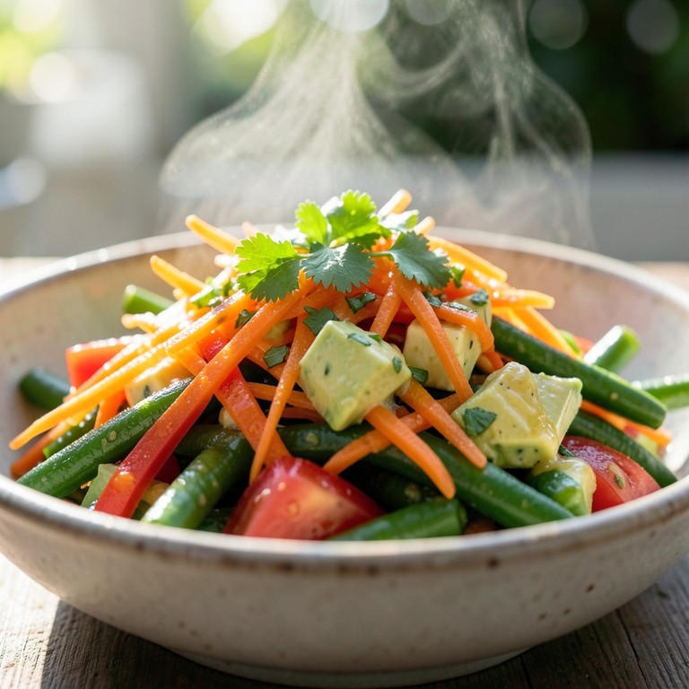 Una combinación vibrante de vegetales crudos con aguacate cremoso y un toque cítrico de cilantro, ideal como acompañamiento ligero y saludable.