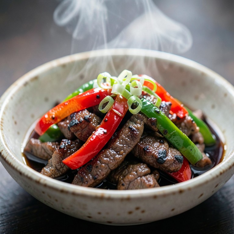 Un salteado vibrante y lleno de sabor que combina tiras de bistec tierno con pimientos coloridos y un toque aromático de soja y jengibre, ideal para una cena rápida y nutritiva.