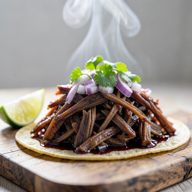 Costilla de vaca cocinada a fuego lento con vino tinto y especias hasta lograr una carne tierna y jugosa, servida en tortillas de maíz con un toque fresco de cilantro y cebolla.