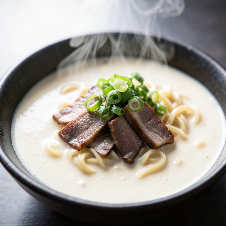 Un ramen reconfortante con un caldo espeso y sedoso logrado gracias a la papa y la crema de leche, coronado con jugosas tiras de carne salteada.