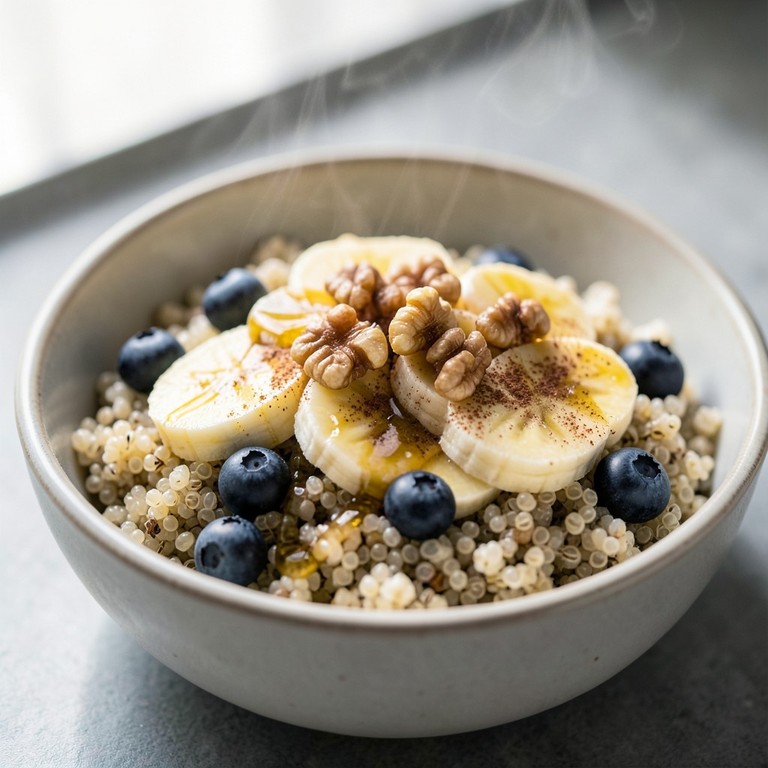 Un tazón nutritivo y reconfortante de quinua tibia, combinado con la dulzura natural del plátano, la frescura de los arándanos y un toque aromático de canela.