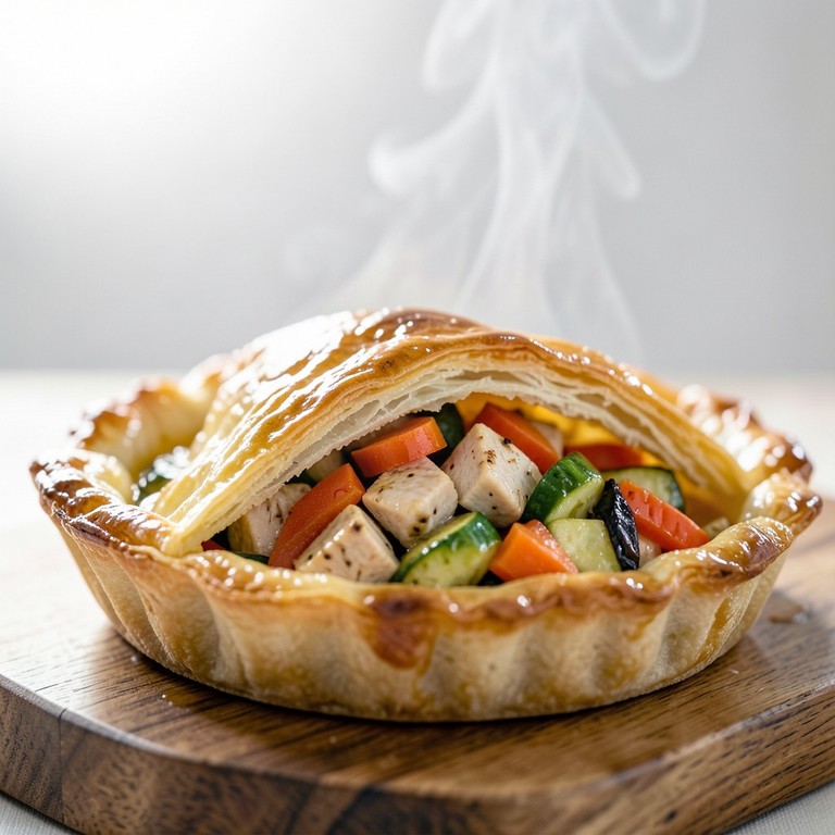 Una tarta rústica de masa crujiente rellena con una mezcla nutritiva de pechuga de pollo salteada y vegetales frescos, perfecta para una comida balanceada y deliciosa.