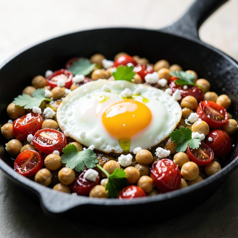 Un plato mediterráneo vibrante y reconfortante que combina la textura de los garbanzos salteados con la dulzura de los tomates cherry, coronado con huevos pochados y el toque salado del queso feta.