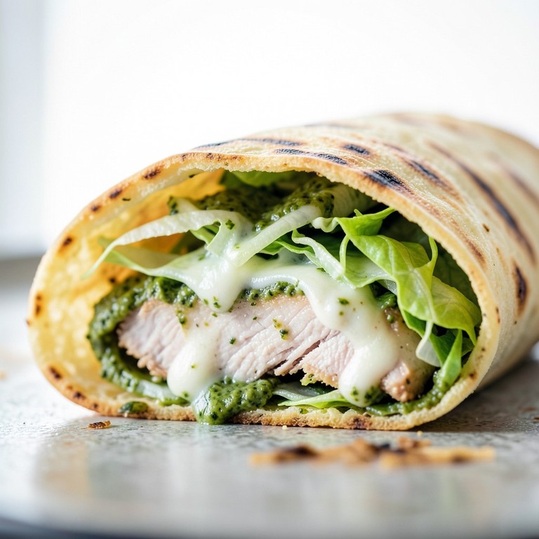 Una deliciosa y fresca combinación de pollo tierno marinado en un vibrante pesto de albahaca, envuelto en una tortilla de harina caliente con queso fundido y un toque crujiente de lechuga.