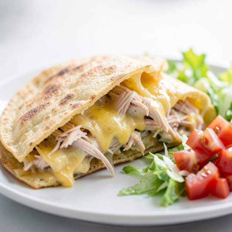 Tortillas de harina doradas y crujientes rellenas de una mezcla irresistible de pollo desmenuzado, crema suave y una combinación fundida de tres quesos, servidas con una ensalada fresca de lechuga y tomate.