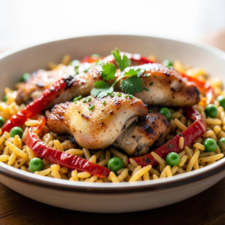 Una variante elegante y aromática del clásico arroz con pollo, enriquecida con el color y sabor del azafrán, pimientos asados dulces y guisantes frescos, perfecta para compartir en ocasiones especiales.