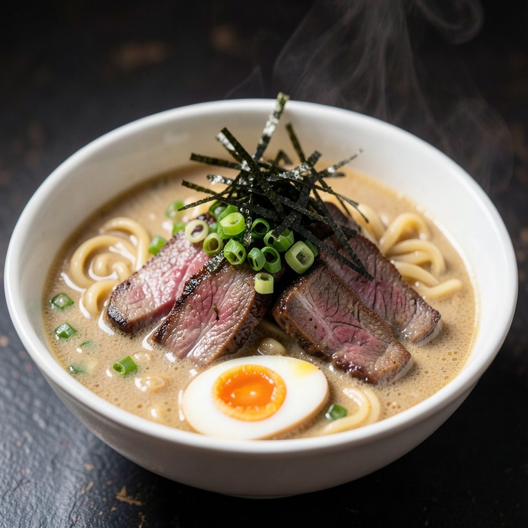 Un ramen reconfortante y casero con un caldo intenso enriquecido con pasta de miso y mantequilla, logrando una textura aterciopelada que envuelve cada bocado de fideos y ternera tierna.