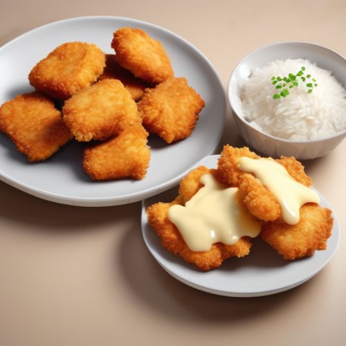 A tasty and crispy chicken nugget dish served with fragrant rice and gooey melted cheese.