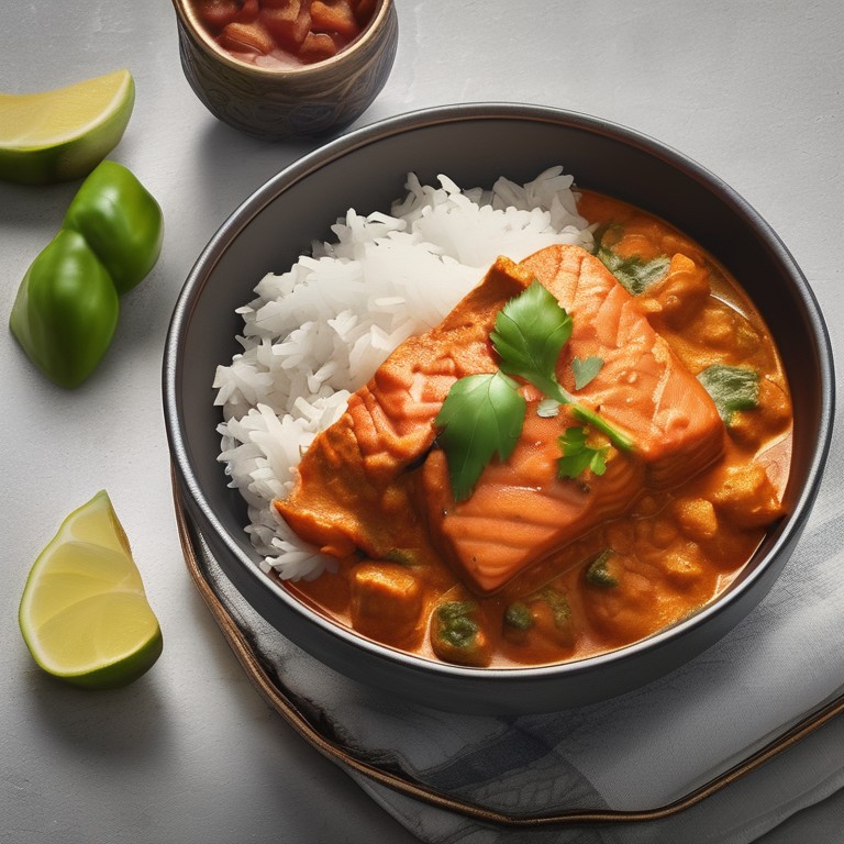 Ein köstliches indisches Curry mit Lachs, serviert mit Reis.