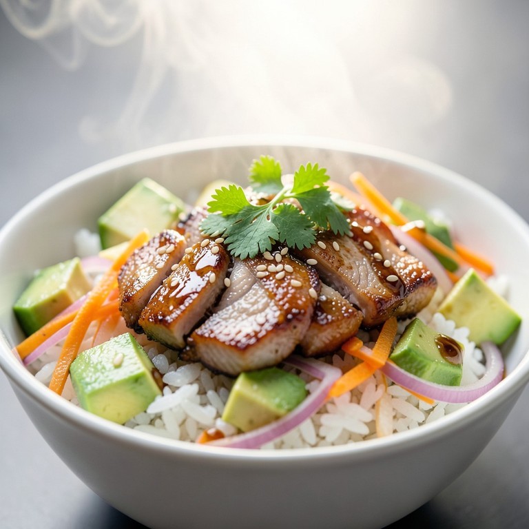 Bol de Riz au Porc Laqué, Carottes et Avocat
