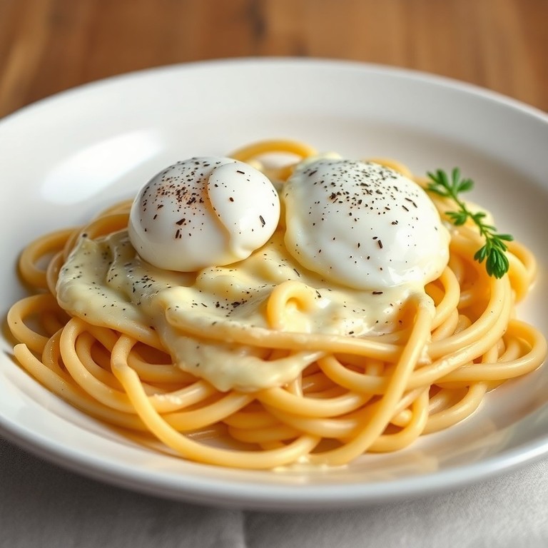 Fideos en Salsa Espesa con Queso y Huevos Poché