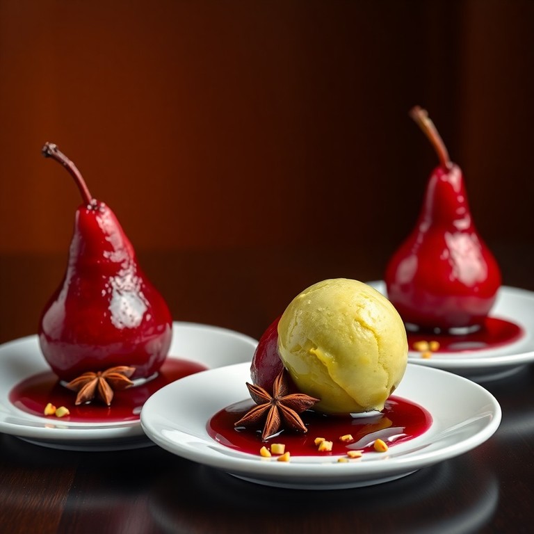 - Poires Pochées au Vin Rouge Épicé, Servies avec Glace à la Pistache