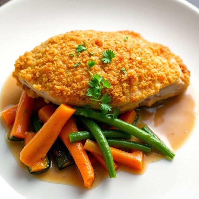 Pollo a la francesa con verduras confitadas en salsa monté