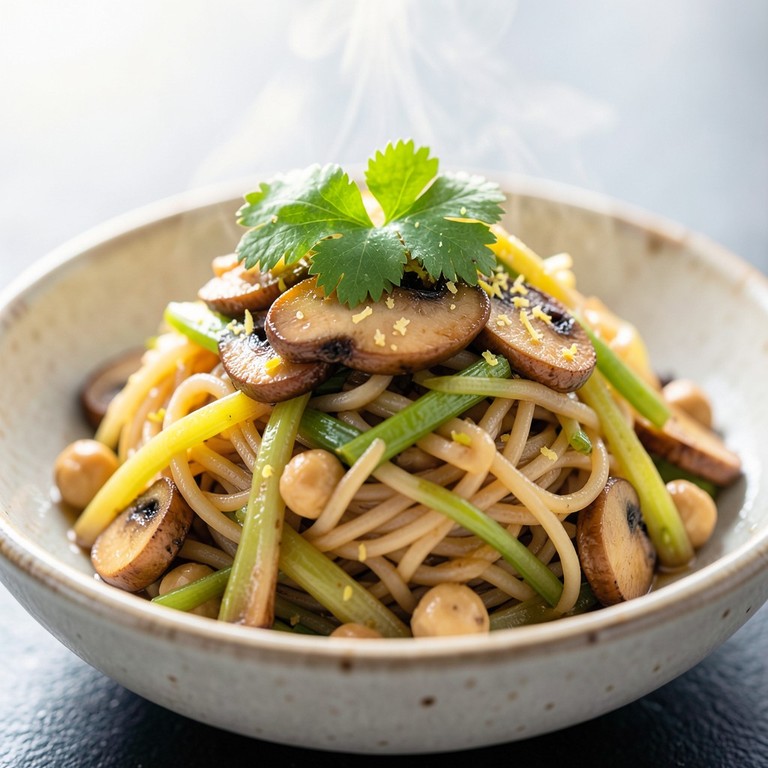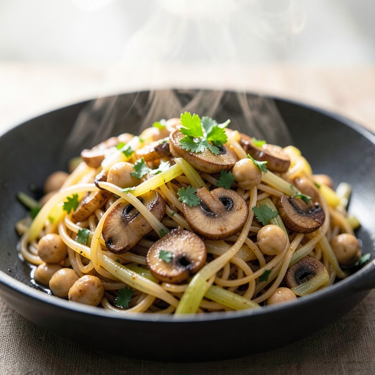 - Poêlée sautée de poireaux, champignons et vermicelles aux pois chiches citronnés
