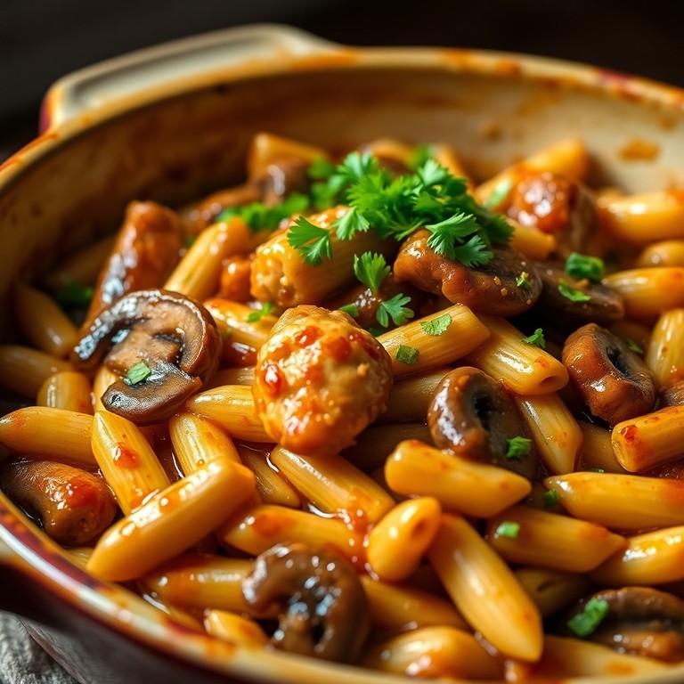 Macarrão ao Forno com Frango, Cogumelos e Molho de Soja