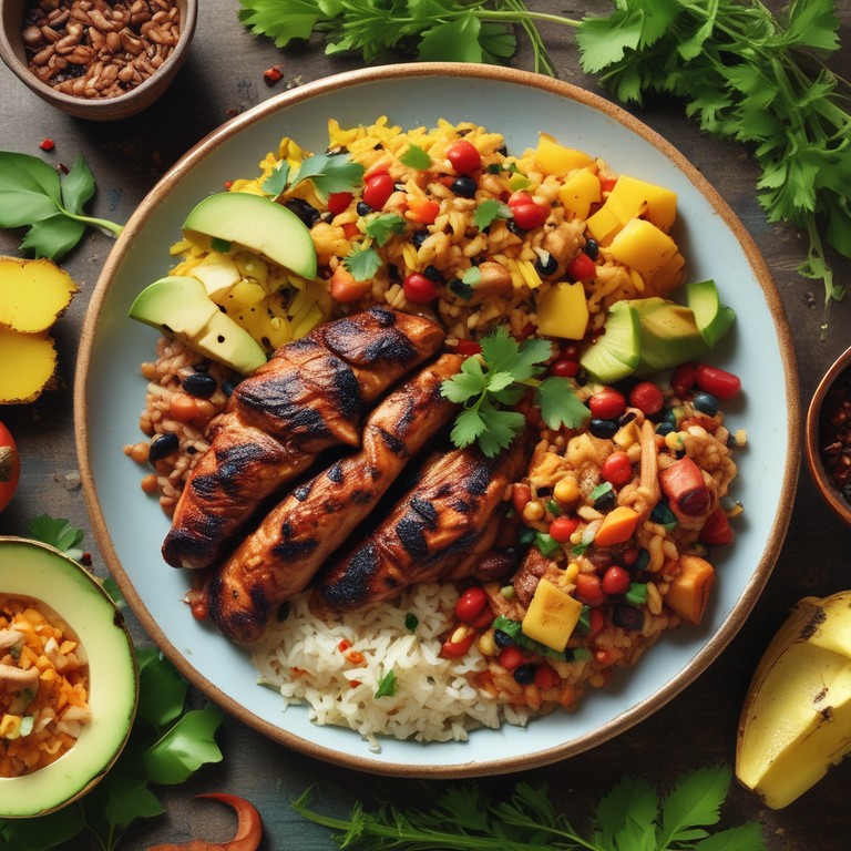 Caribbean Jerk Chicken with Grilled Pineapple and Seasoned Rice & Beans