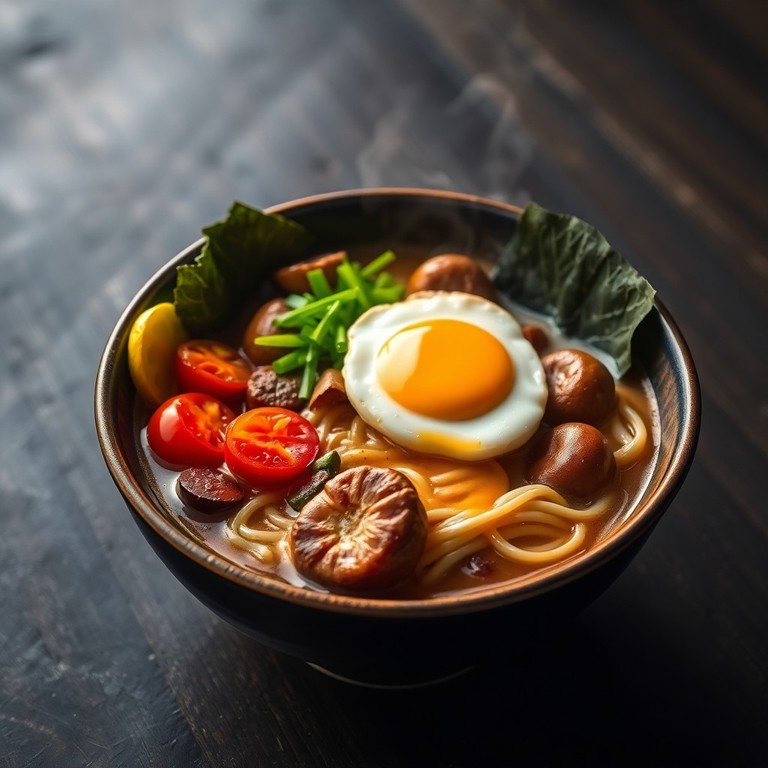 Ramen Sauté aux Champignons, Tomates et Saucisse à la Thaï
