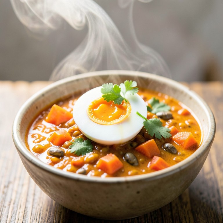 Curry de Lentilles Corail aux Carottes et Sardines Émiettées, surmonté d'un Œuf Mollet