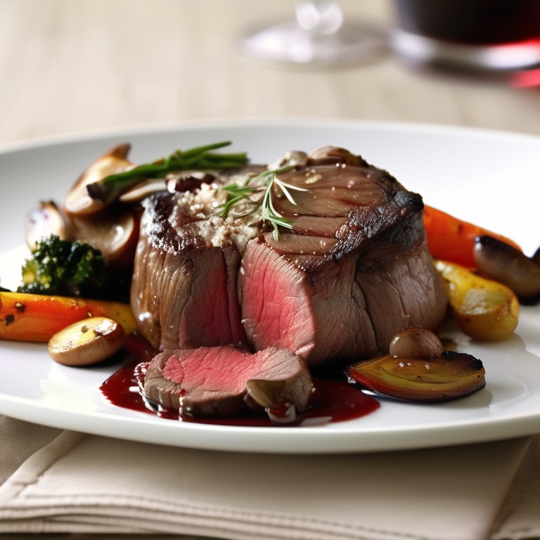Filet Mignon aux Légumes Rôtis, Champignons et Sauce au Vin Rouge