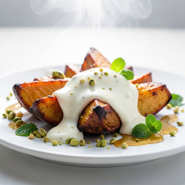 Patate Douce Rôtie, Crème de Féta, Miel et Pistaches