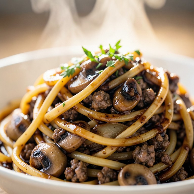 Pâtes au Bœuf, Champignons et Oignons Sautés