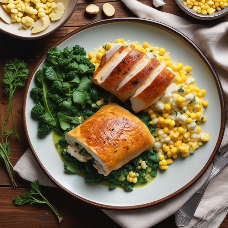 Creamy Spinach and Mascarpone Chicken Rolls with Savory Mashed Potatoes and Corn