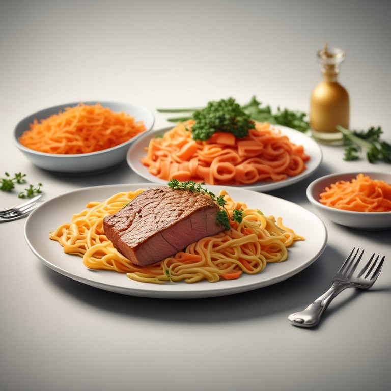 Plat Complet: Purée de Carottes, Pâtes, Steak Haché et Saumon