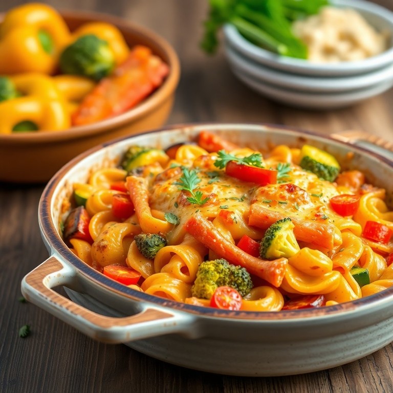 Bunter Gemüse-Nudel-Auflauf mit goldener Käseschicht