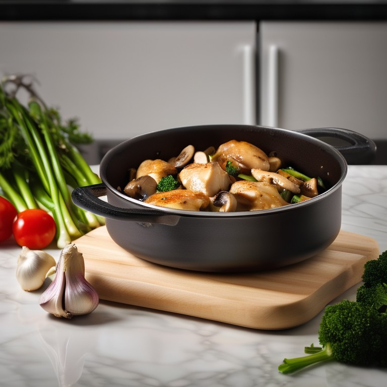 Un plat savoureux de poulet sauté avec des légumes frais et des arômes de gingembre et d'ail, associé à des champignons pour une texture délicieuse.