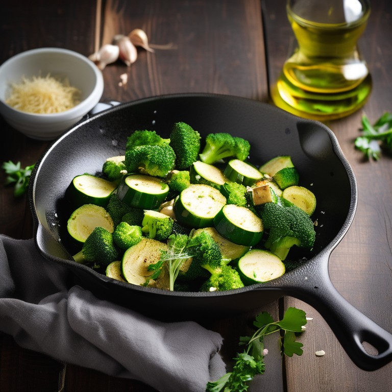 Un délicieux plat de courgettes et de brocoli sautés à l'ail et aux herbes.