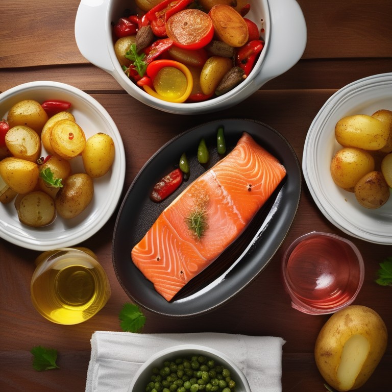 Un plat délicieux et coloré de saumon cuit avec des poivrons jaunes, verts et rouges, accompagné de pommes de terre rôties. Un repas savoureux et équilibré qui ravira vos papilles.
