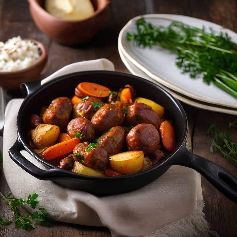 Un plat délicieux et savoureux mettant en valeur les saveurs des merguez épicées avec des pommes de terre tendres, des carottes sucrées, de l'ail parfumé et des échalotes douces. Parfait pour un repas copieux et chaleureux.