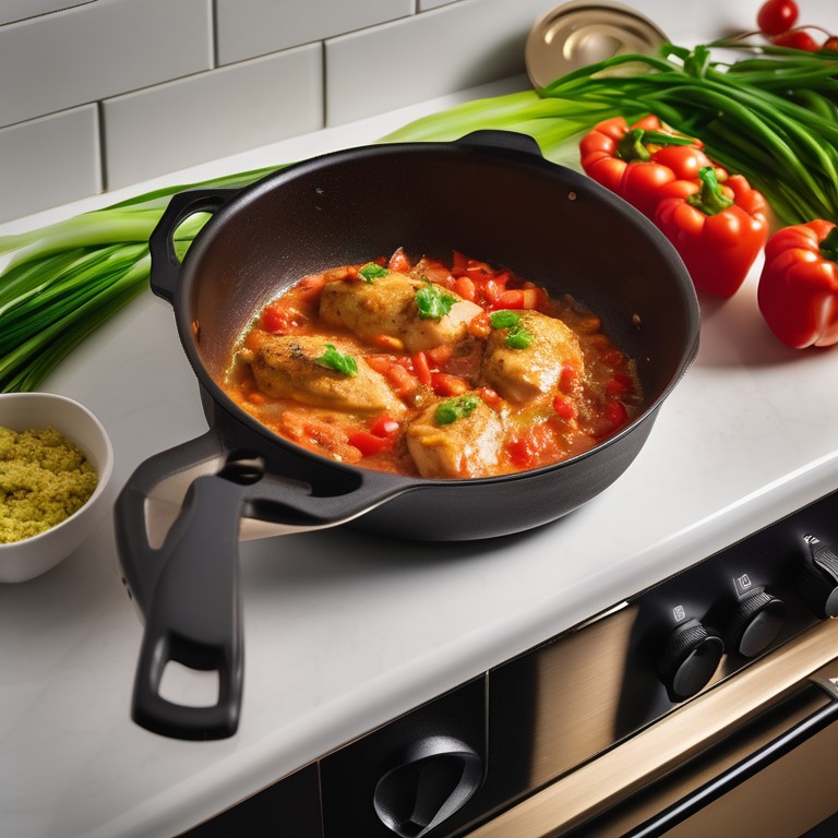 Ein köstliches Gericht mit saftig gebratener Hähnchenbrust in einer aromatischen Paprika-Pesto-Sauce, verfeinert mit frischen Frühlingszwiebeln und passierten Tomaten. Ein wahres Geschmackserlebnis!