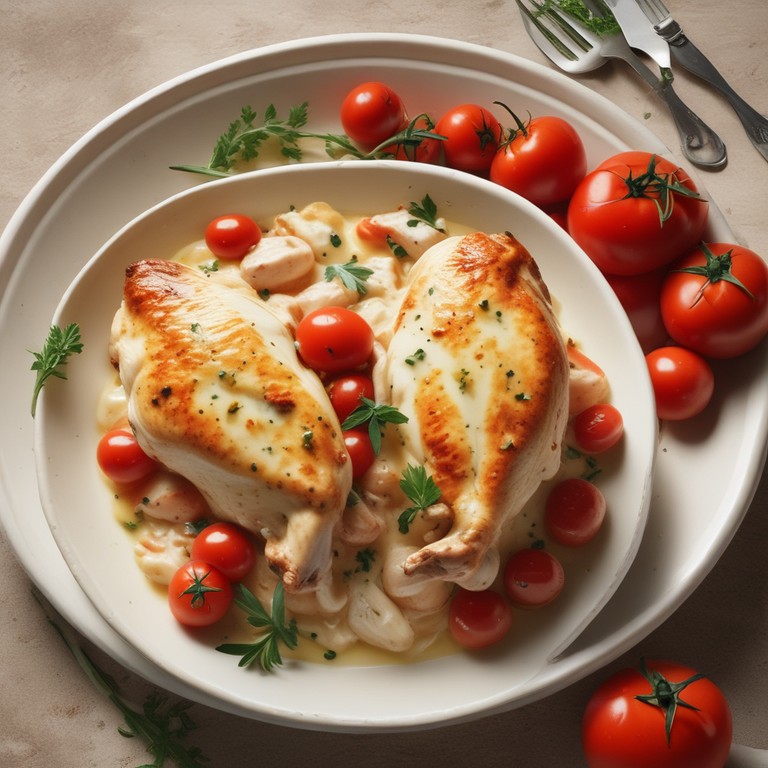 Un délicieux plat de poulet cuit avec une sauce crémeuse au Boursin et des tomates juteuses.