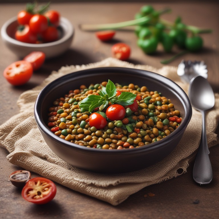 Un délicieux plat de lentilles vertes mijotées avec des tomates en conserve pour une saveur riche et satisfaisante.