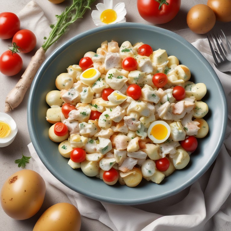 Une délicieuse salade de pommes de terre avec des morceaux de poulet tendre, des œufs durs, des oignons croquants et des tomates juteuses. Cette salade est parfaite pour un déjeuner léger ou un dîner savoureux. Les saveurs se marient parfaitement pour créer un plat équilibré et délicieux.