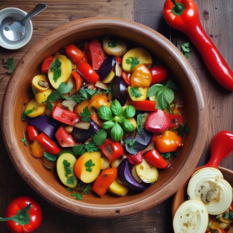 Un ragoût de légumes d'été coloré et savoureux, parfait pour profiter des légumes frais de saison. Ce plat est idéal comme accompagnement ou plat principal léger.