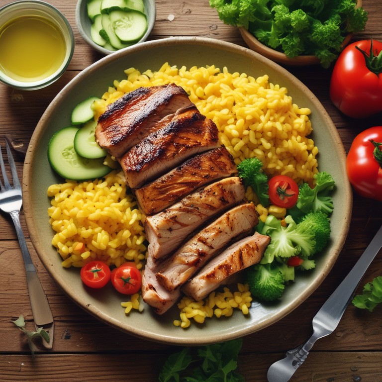 Este plato combina la calidez del arroz amarillo con maíz dulce y la jugosidad del lomo de cerdo a la plancha, acompañado de una ensalada fresca, ideal para una comida completa y saludable.