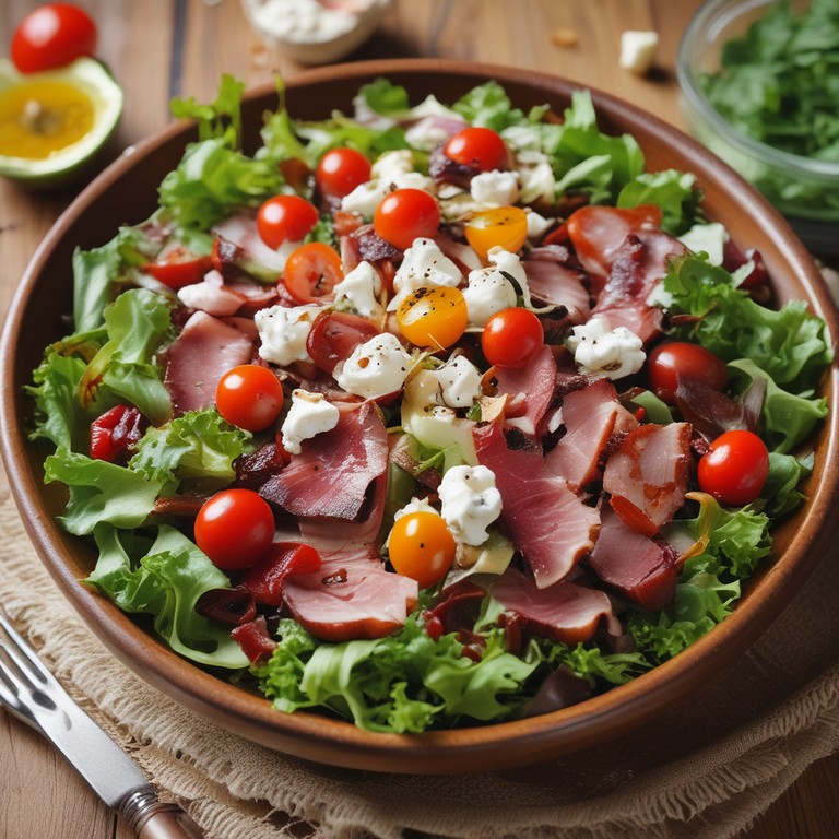 Une délicieuse salade composée de lardons croustillants, de salade verte fraîche, de tomates cerises et de fromage de chèvre, le tout assaisonné d'une vinaigrette à la moutarde.
