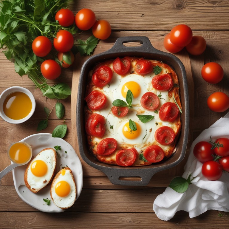 Un plat savoureux et réconfortant, parfait pour un brunch ou un dîner léger, combinant des tomates juteuses, de la mozzarella fondante et des œufs de vache.