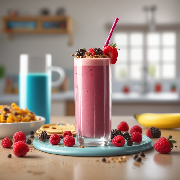 Un smoothie énergique et délicieux, parfait pour le petit-déjeuner ou un en-cas, combinant des fruits frais, du granola croquant et une touche de douceur avec du sirop de grenadine.
