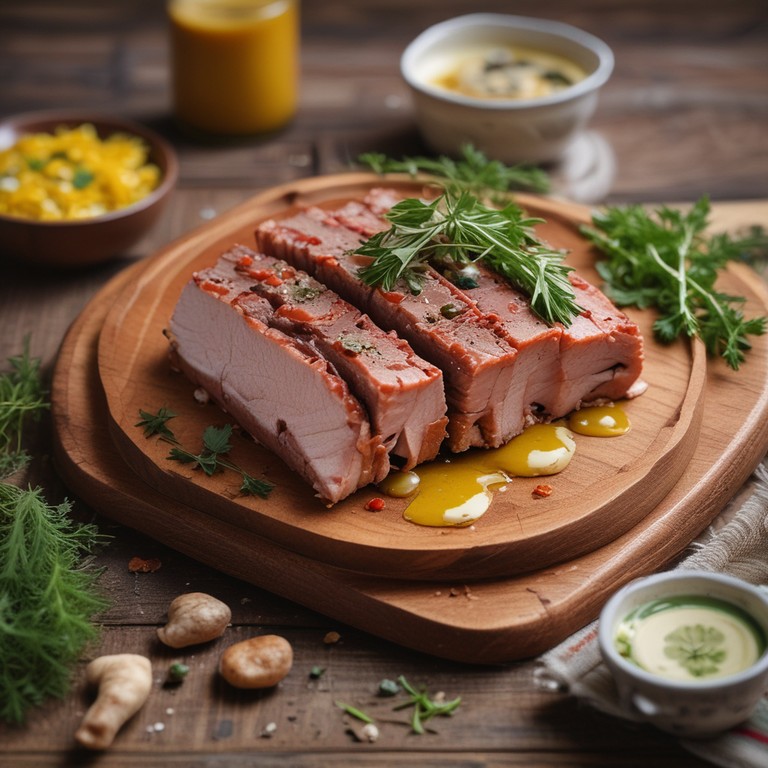 Une version revisitée du presskopf alsacien, cette terrine traditionnelle est préparée avec de la tête et du jarret de porc, assaisonnée de moutarde et d'herbes fraîches. Parfaite pour un repas convivial, elle se déguste avec du pain frais et des cornichons.