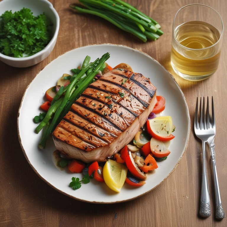 Un plat savoureux de steak de thon grillé, mariné dans une délicieuse sauce citronnée, parfait pour un dîner léger et raffiné.