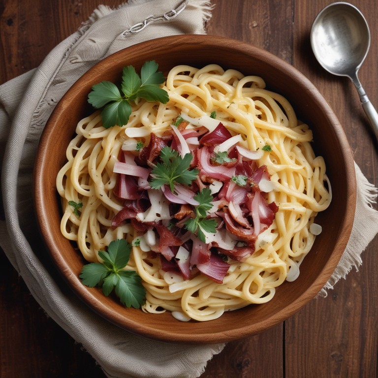 Une recette de pâtes crémeuses savoureuse, combinant des lardons croustillants et des oignons rouges, le tout nappé d'une sauce à la crème et au fromage Gruyère.