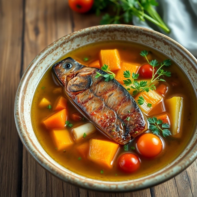 Un bouillon riche et parfumé, parfait pour les jours frais, combinant le goût fumé du poisson avec des légumes frais et des herbes aromatiques.