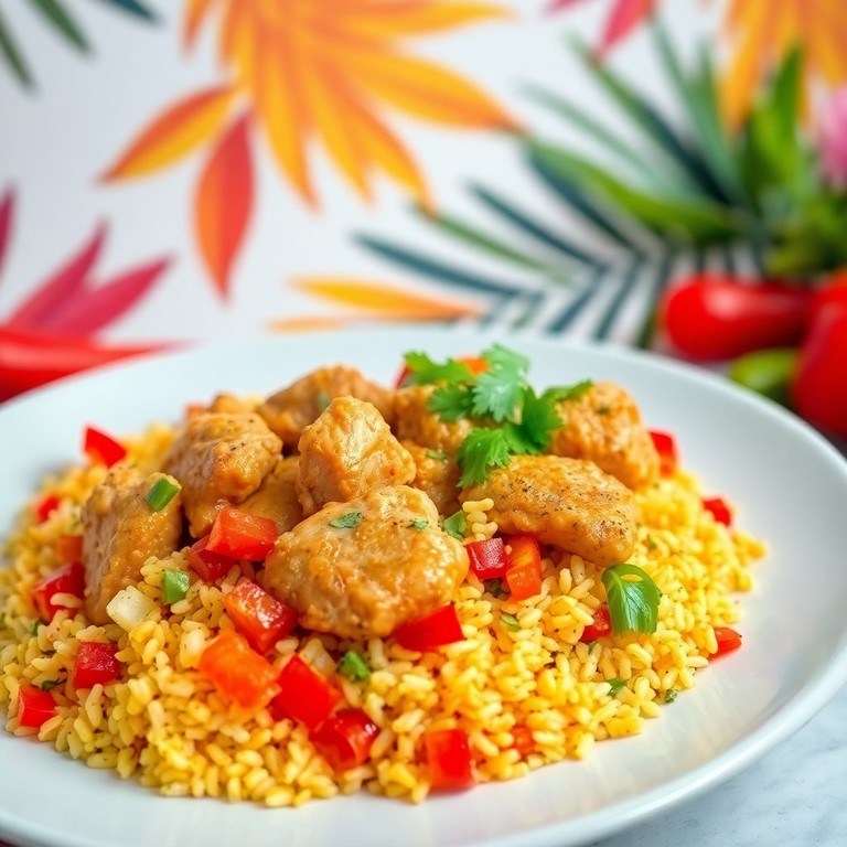 Un plat savoureux aux influences caribéennes, combinant du riz basmati parfumé avec des cuisses de poulet épicées et des légumes colorés, parfait pour un repas convivial.
