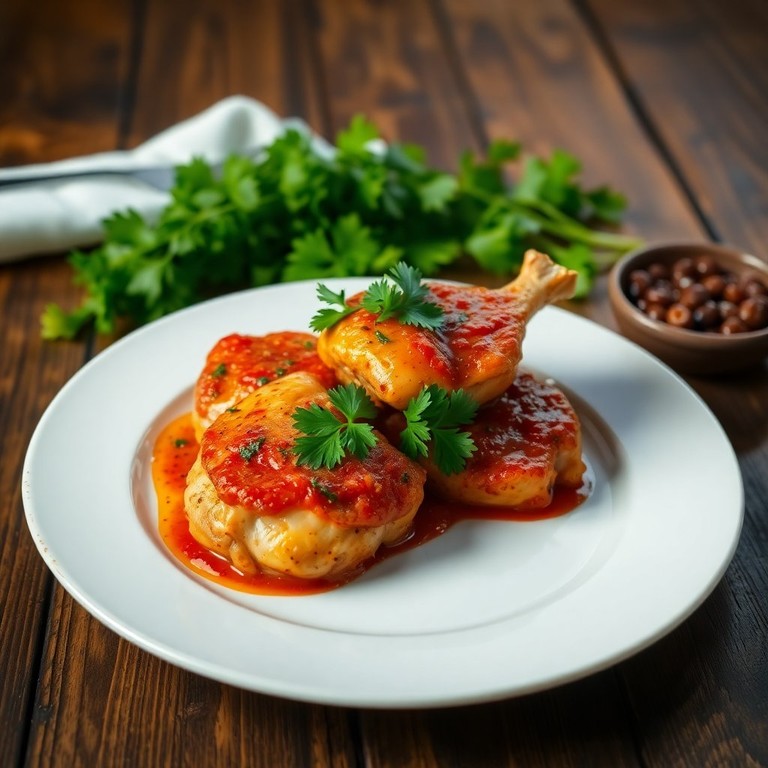 Это блюдо представляет собой курицу, замаринованную в ароматном томатном соусе с чесноком и специями, запеченную до золотистой корочки. Идеально подходит для семейного ужина или праздничного стола.